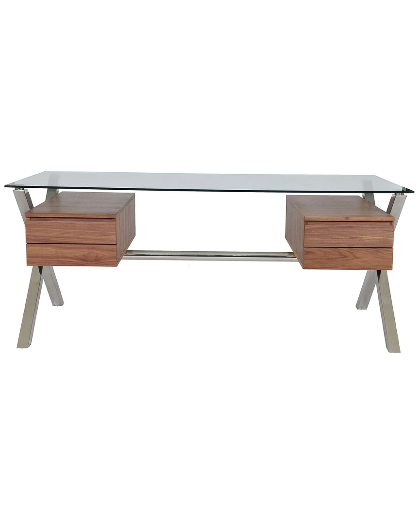 - Design details: Ultra modern large desk with 2 sets of 2 pull-out soft close drawers (4 total drawers) 2 open compartments located in the back tempered glass and high polished steel X-legs. Drawer box measures 34Wx16Dx9.5. Inside drawer measures 12Wx17Dx2H (each). Inside leg width is 32″; Inside open back compartment measures 14Wx12Dx8H (each); Very modern and edgy.A ; tempered glass wood veneer and high polished steel legs