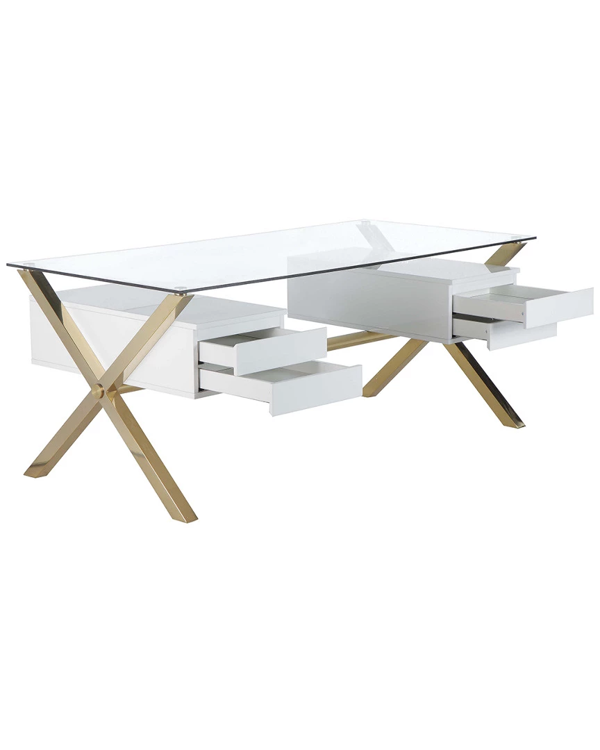 - Design details: Ultra modern large desk with 2 sets of 2 pull-out soft close drawers (4 total drawers) 2 open compartments located in the back tempered glass and high polished gold steel X-legs. Drawer box measures 34Wx16Dx9.5. Inside drawer measures 12Wx17Dx2H (each). Inside leg width is 32″; Inside open back compartment measures 14Wx12Dx8H (each); Very modern and edgy.A ; tempered glass high gloss lacquer and high polished gold steel legs