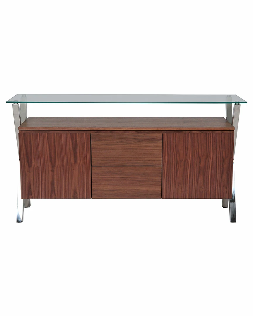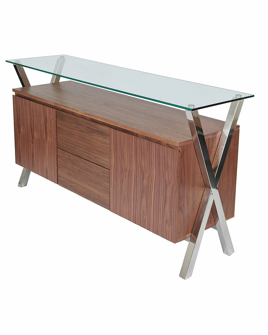 - Design details: Ultra modern dining buffet with 2 pull-out soft close drawers and 2 doors tempered glass and high polished steel X-legs. Very modern and edgy.A Height between glass and top is 6″. Inside each drawer measures 16Wx15Dx5H; Inside each door measures 18Wx16Dx16H; Each door has 1 shelf with 3 different adujustable positions; Cabinet part of buffet including all drawers and doors is fully assembled; assembly requires legs to be attached to already assembled cabinet part; wood veneer with high polished steel legs and tempered glass top