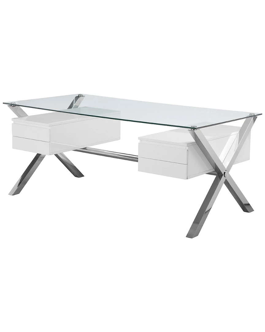 - Design details: Ultra modern large desk with 2 sets of 2 pull-out soft close drawers (4 total drawers) 2 open compartments located in the back tempered glass and high polished steel X-legs. Drawer box measures 34Wx16Dx9.5. Inside drawer measures 12Wx17Dx2H (each). Inside leg width is 32″; Inside open back compartment measures 14Wx12Dx8H (each); Very modern and edgy.A ; tempered glass high gloss lacquer and high polished steel legs