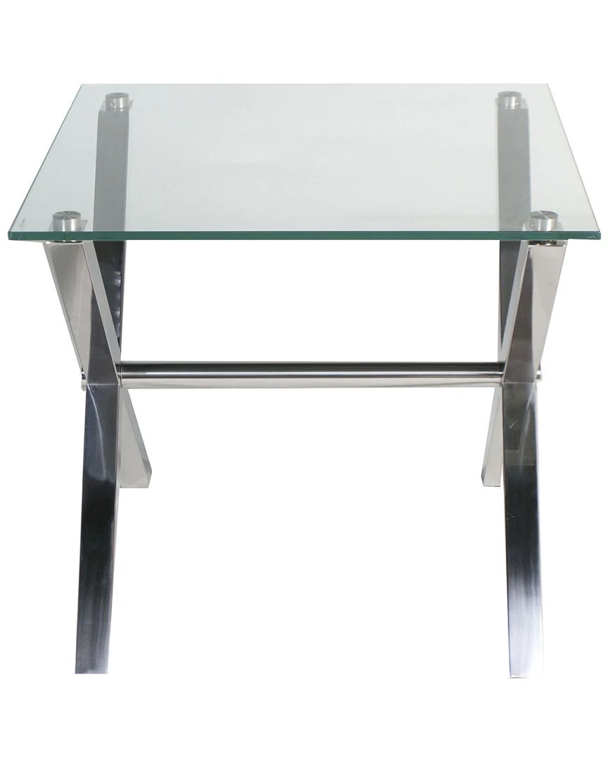 - Design details: Rectangular tempered glass side/end table with high polished steel X-legs. Very modern and edgy. Top attached to legs.A ; tempered glass with high polished steel legs