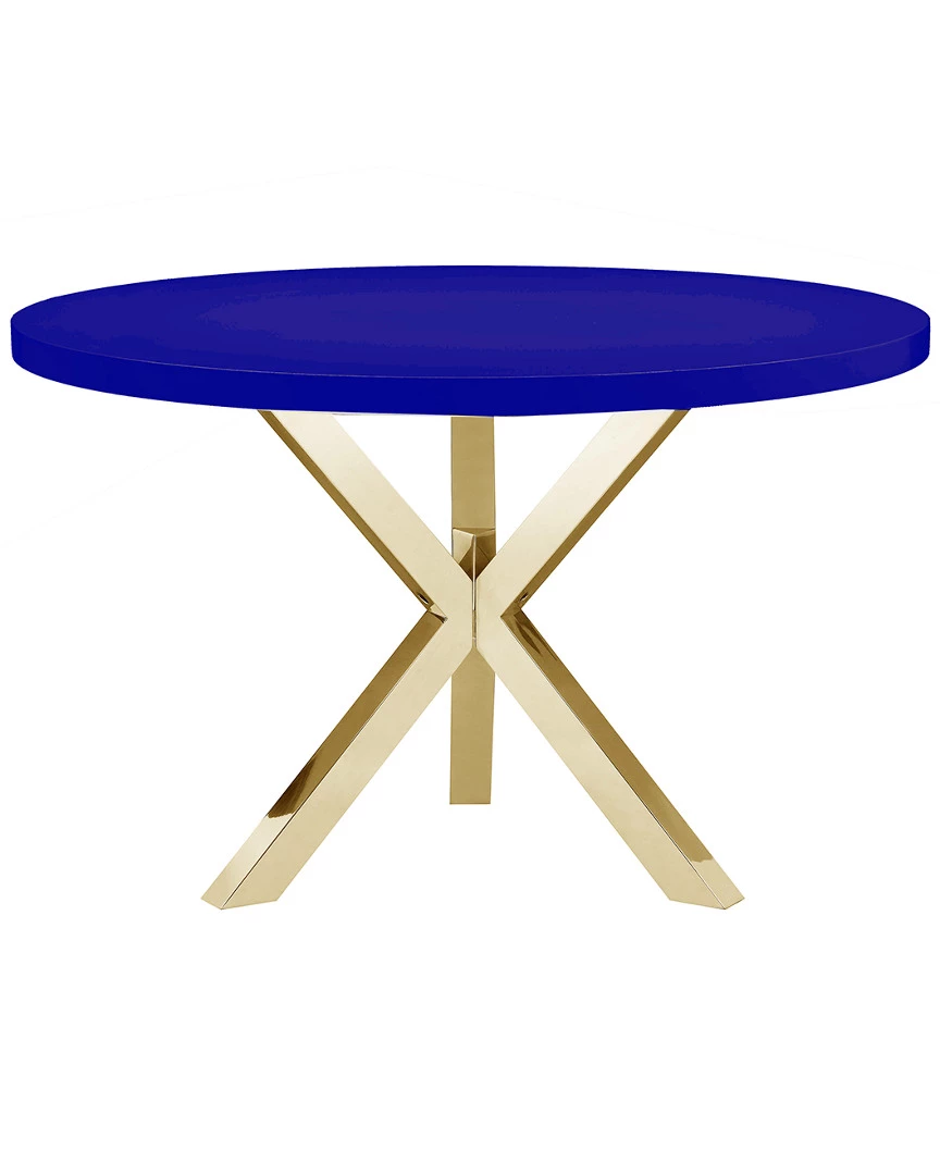 - Design details: Round dining table and fun x-twisted Gold toned high polished steel legs. Table top is approximately 2″; Sits 4-5; high gloss lacquer and high polished steel legs