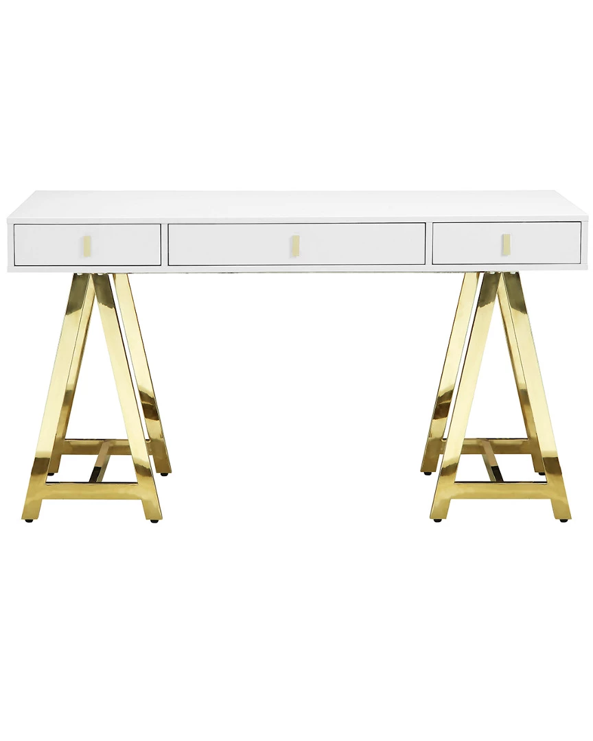 - Design details: Elegant and modern 3-drawer desk with gold frame; Each side drawer measures approximately 13Wx15.5Dx2.5H; Middle drawer measures 23.5Wx15.5Dx2.5H;” Desk top including all drawers is fully assembled; high gloss lacquer with steel legs