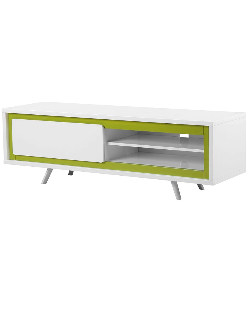 - Design details: Retro Modern short Media unit with 1 pull out soft close drawer and 1 open compartment for all of your media needs. Inside drawer measures 24.5Wx13Dx5H; Inside open compartment measures 26Wx16Dx8H; Open compartment comes with 1 shelf and 3 adjustable positions. Inside back of media unit has an open circle for your wiring; cabinet part including all drawers and doors is fully assembled. Assembly requires legs to be attached to already fully assembled cabinet part; high gloss lacquer top metal legs