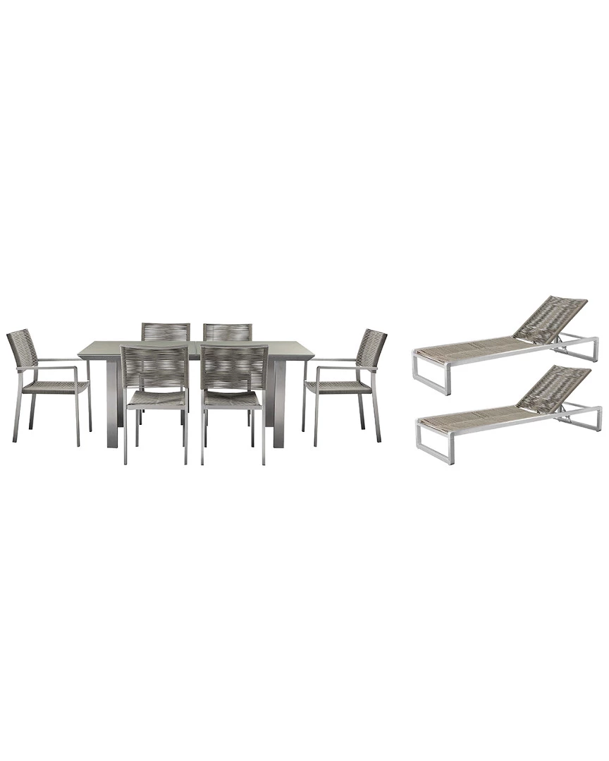 - Design details: This 9 Piece patio set was created by our designers to help customers spend more time enjoying their backyards and less time searching online for a matching patio collection. This 11 piece patio set features 6 patio dining chairs, 1 large patio dining table and 2 loungers. Featuring sleek lines and modern designs, with one purchase, you can transform your patio space into the private resort get-a-way you have always wanted.