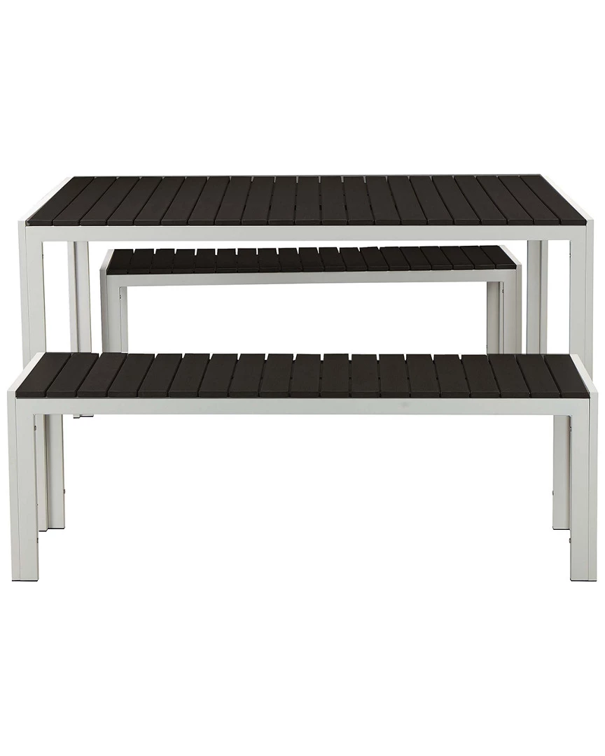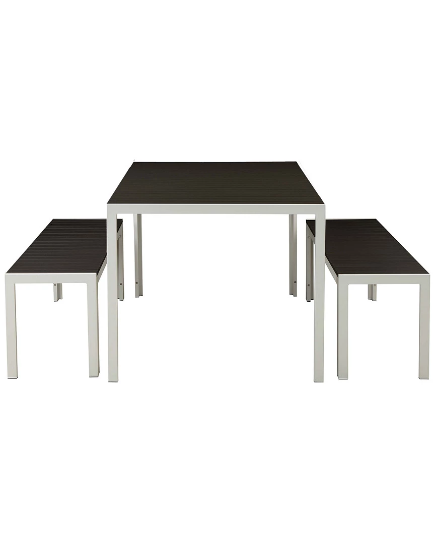 - Sleek modern 3 piece dining set. This set consist of 2 benches and one dining table. Benches fit under dining table for storage. Thickness of dining table top is 2 inchesDistance between the two legs width: 32; Distance between the two legs length: 55