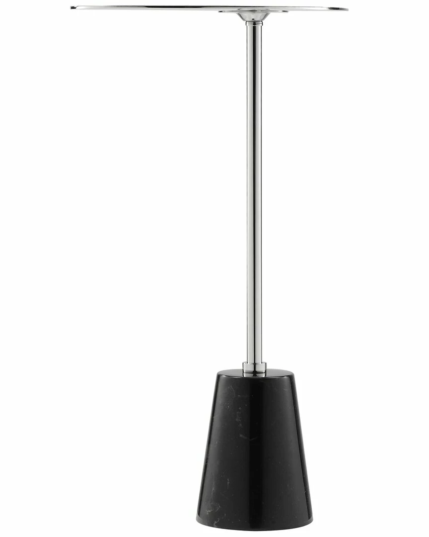 - Relax with your favorite drink and this edgy modern drink table with its oval high polished metal top and cone shaped genuine marble base; Perfect for small areas.