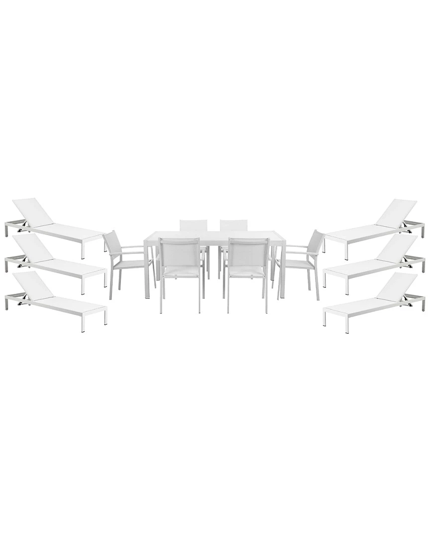 - Design details: This 13 Piece patio set was created by our designers to help customers spend more time enjoying their backyards and less time searching online for a matching patio collection. This 13 piece patio set features 6 patio dining chairs, 1 large patio dining table and 6 loungers Featuring sleek lines and modern designs, with one purchase, you can transform your patio space into the private resort get-a-way you have always wanted.