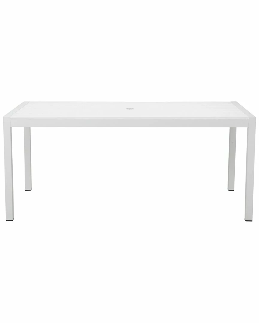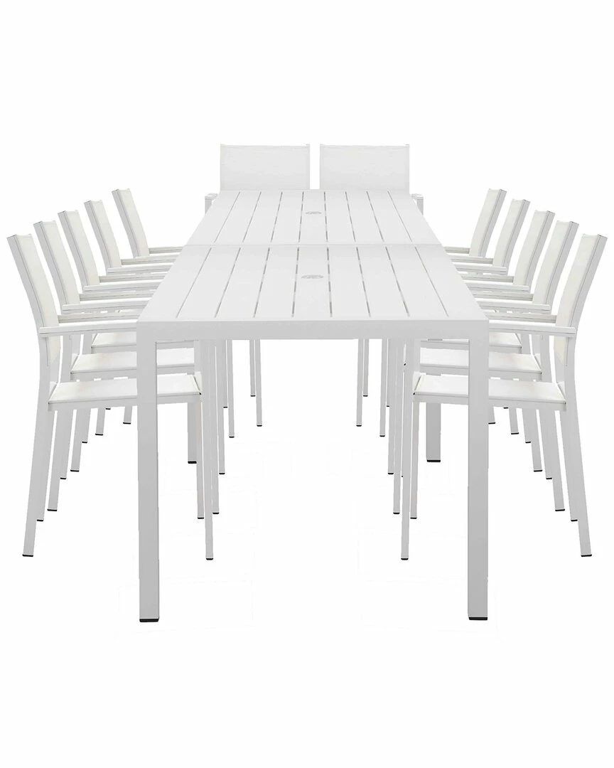 - Beautiful minimalist 14 Piece dining set that is built to last. You will love this set for its durable frame, high pressured polyresin slats and stackable chairs. Tables are easily to assemble, just attached legs to frame. Table features 2″ umbrella hole.