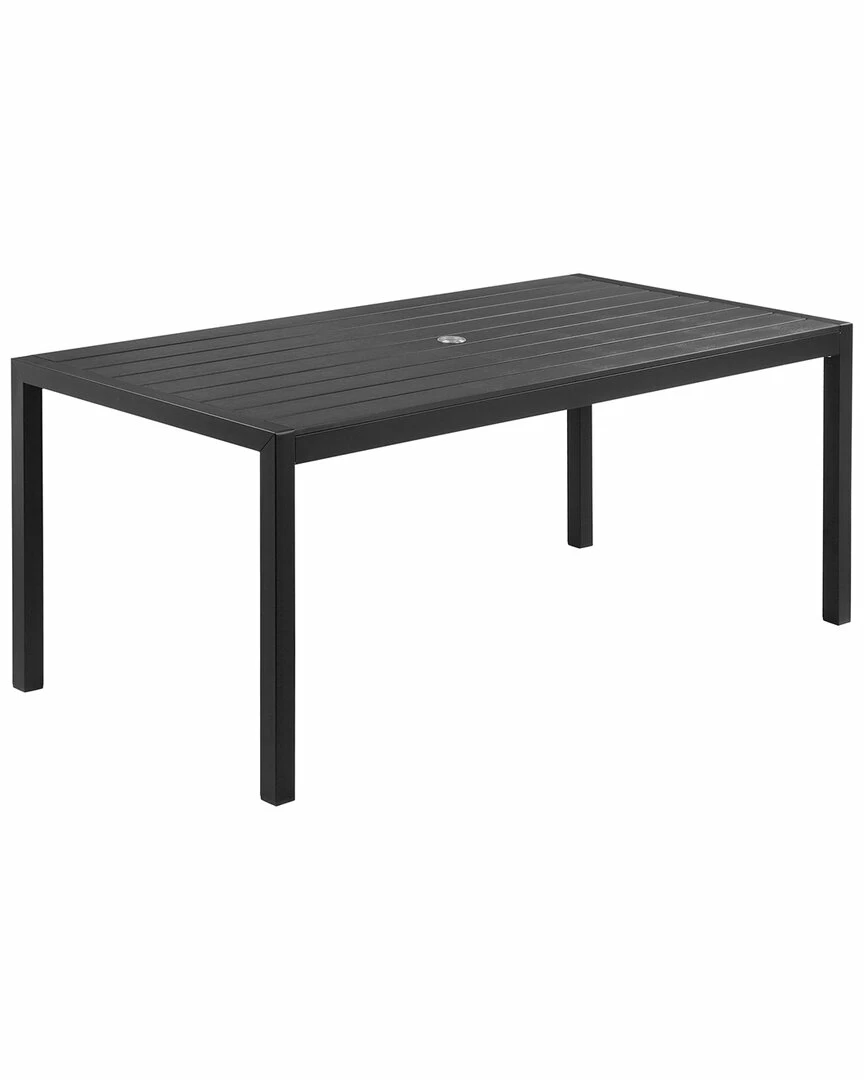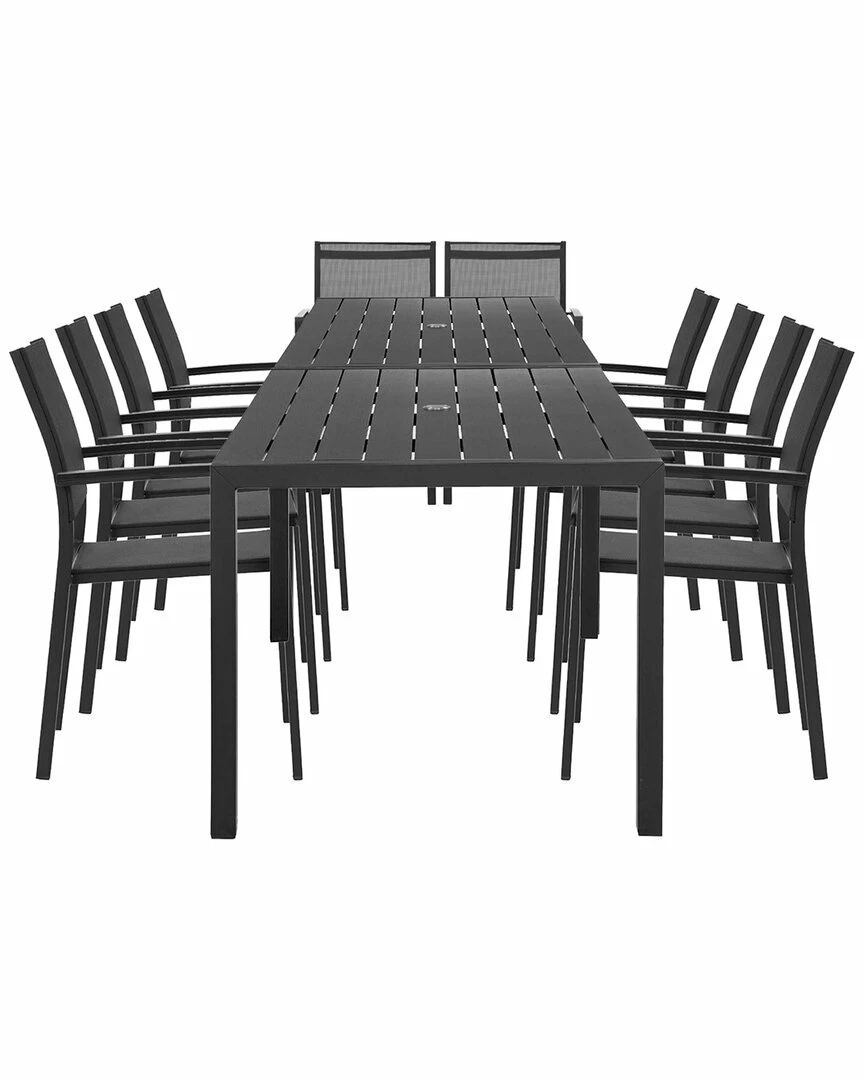 - Beautiful minimalist 14 Piece dining set that is built to last. You will love this set for its durable frame, high pressured polyresin slats and stackable chairs. Tables are easily to assemble, just attached legs to frame. Table features 2″ umbrella hole.