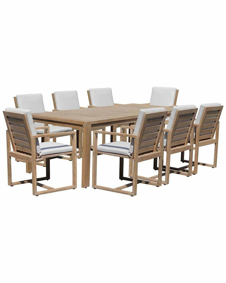 - Beautiful 9 Piece dining set that is made from acacia wood. You will love this set for its modern design and natural wood finish