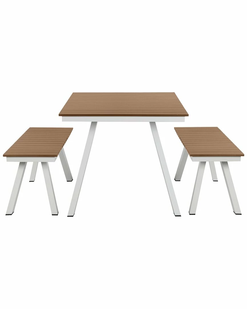 - Beautiful minimalist 3 Piece dining set that is built to last. You will love this set for its durable frame and high pressured polyresin slats.