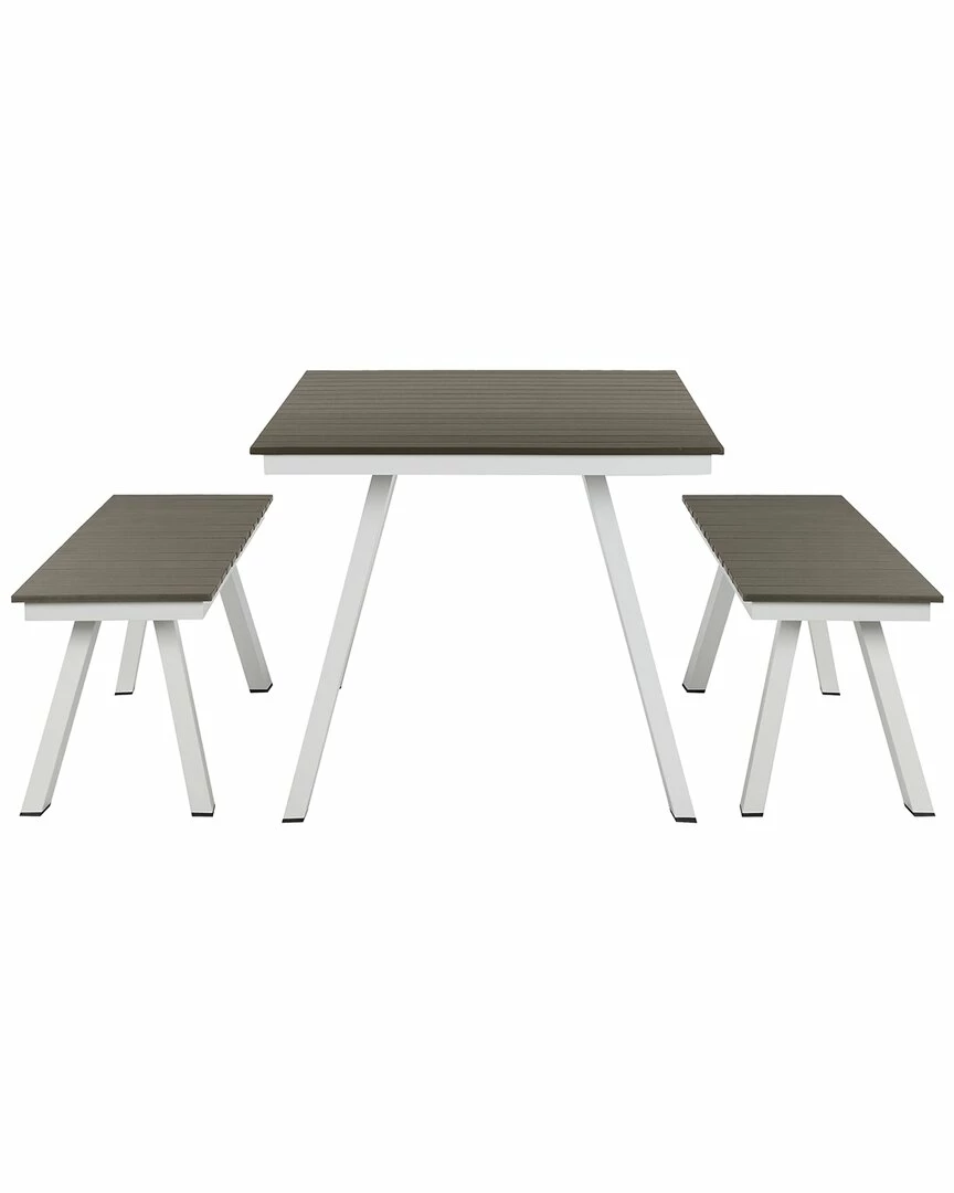 - Beautiful minimalist 3 Piece dining set that is built to last. You will love this set for its durable frame and high pressured polyresin slats.