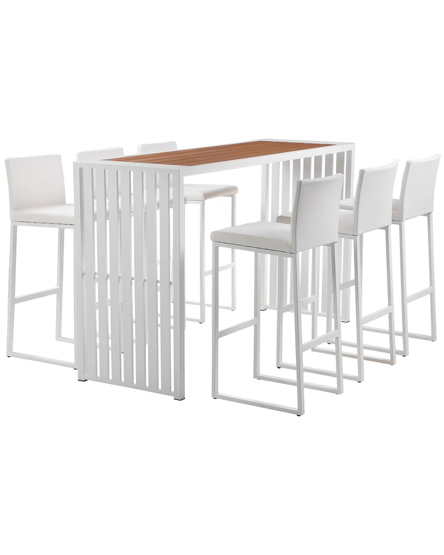 - Don’t like to assemble furniture? Then this is the bar set for you. Beautiful and modern this 7-piece bar set is the perfect addition your backyard space. Table and chairs are made from an anodized aluminum frame, that prevents rusting and fading. Table top is made with pressurized polyresin slats that allow water to seep through and while the pressurized polyresins prevent molding. Chair back and seat is made from a textile mesh that prevents water from seeping through to the cushion. This set includes 6 stools and 1 bar table, so call up some friends, make a pitcher of your favorite cocktail and start having fun this summer in your backyard space.