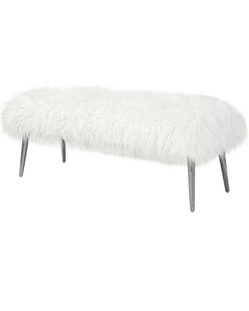 - Design details: Glam bench for entry living bedroom and any other space to add some posh. Seat height is approx. 17″; seat depth is approx. 19″; foam density is 2 PCF (high density foam); Simple assembly required to assemble seat to legs; metal; faux fur
