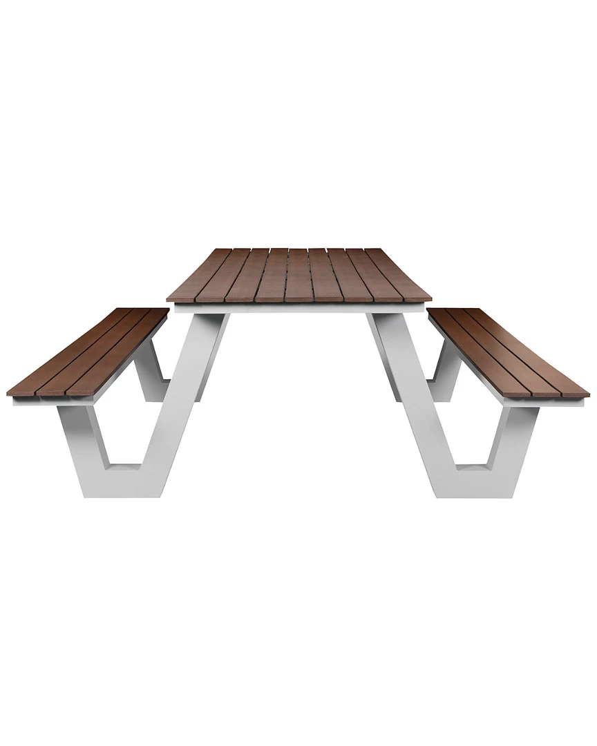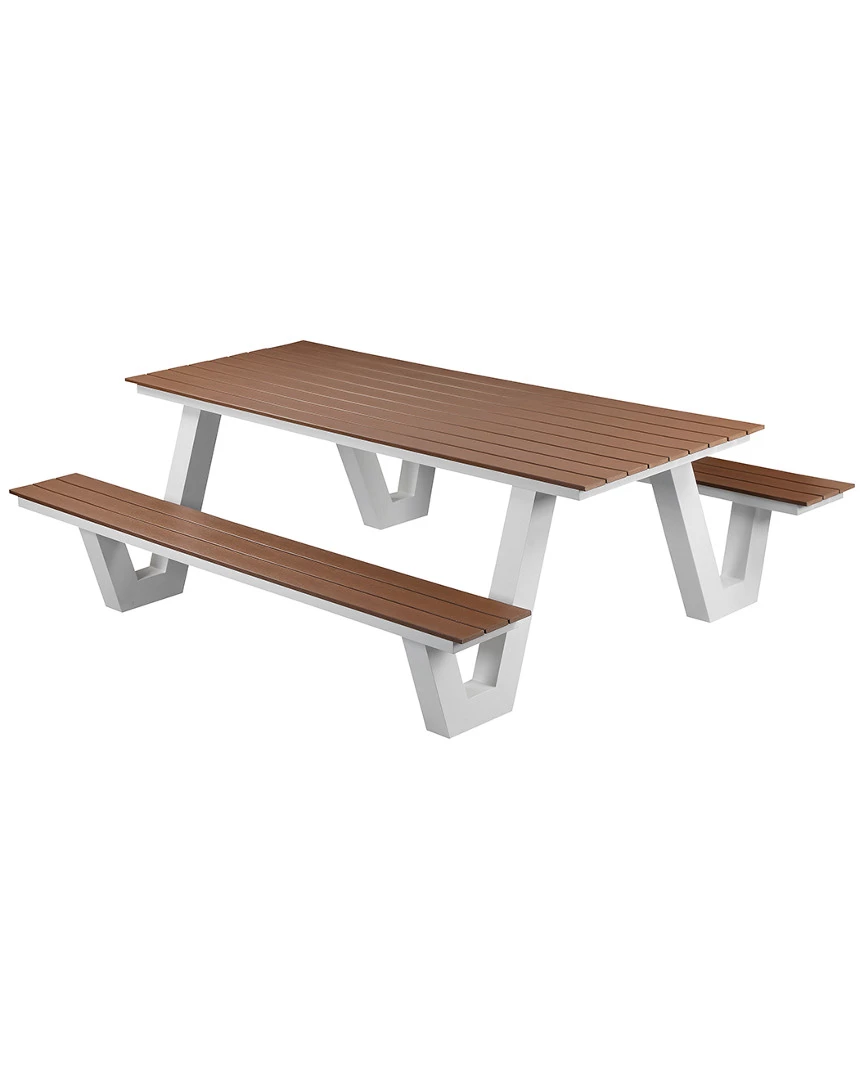 - Design details: Clean, modern, and contemporary. These are the words you will be using when you describe your new favorite patio table to your friends and family. Bench’s and table are made from a white anodized aluminum frame and Polynesian top. Assembly is a breeze. Just attach the benches to the table frame. Slats on benches and table top allow water to seep through. Comfortably can sit 8 to 10 people. So, pop a bottle a champagne, slice a few oranges and call over some of your favorite people to enjoy your new outdoor table with.