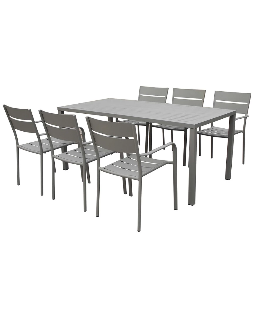 - Design details: Sleek modern 7 piece outdoor dining set. This 7 piece set consist of 6 arm chairs and one large dining table that can fit up to 6 people. You’ll love this set for its bold color and sleek finish.