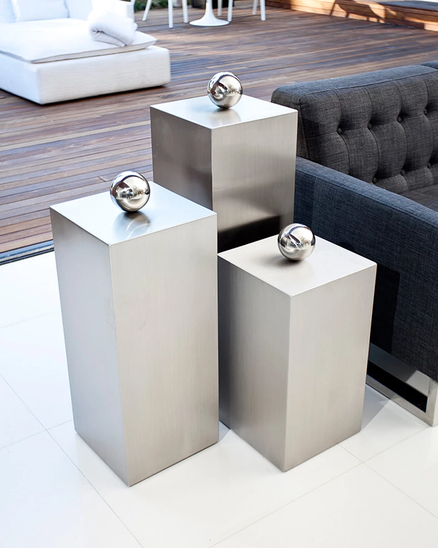 - Design details: Set of 3 pedestals in varying heights.A Great for use with plants or other items to be displayed or all alone to fill corners of a room.A No assembly required; brushed steel