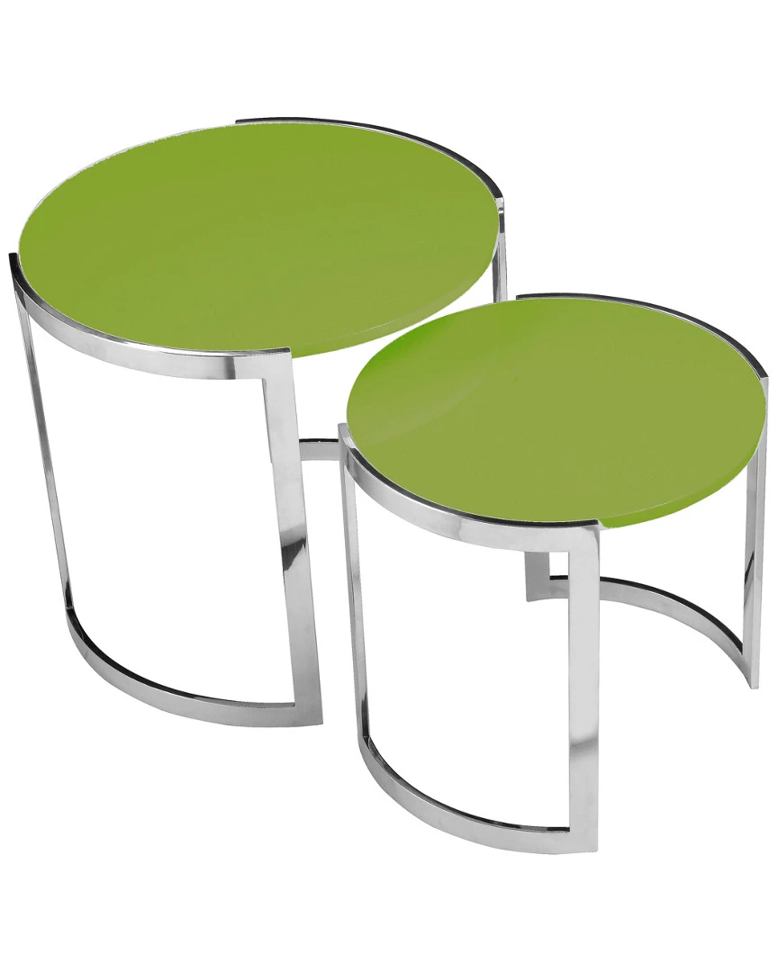 - Design details: 2 Round side tables that nest together; modern and useful; the smaller one inserts right under the larger one; the large side table measures 21Wx21Dx20H; smaller side table measures 17Wx17Dx17H; high gloss lacquer and high polished steel frame