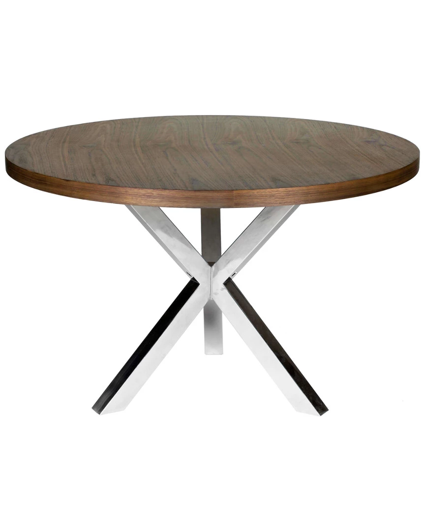 - Design details: Round dining table and fun x-twisted high polished steel legs. Table top is approximately 2″; Sits 4-5; wood veneer and high polished steel legs