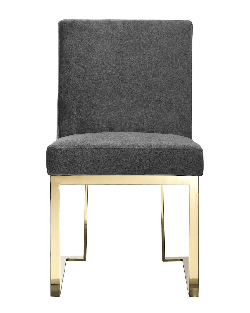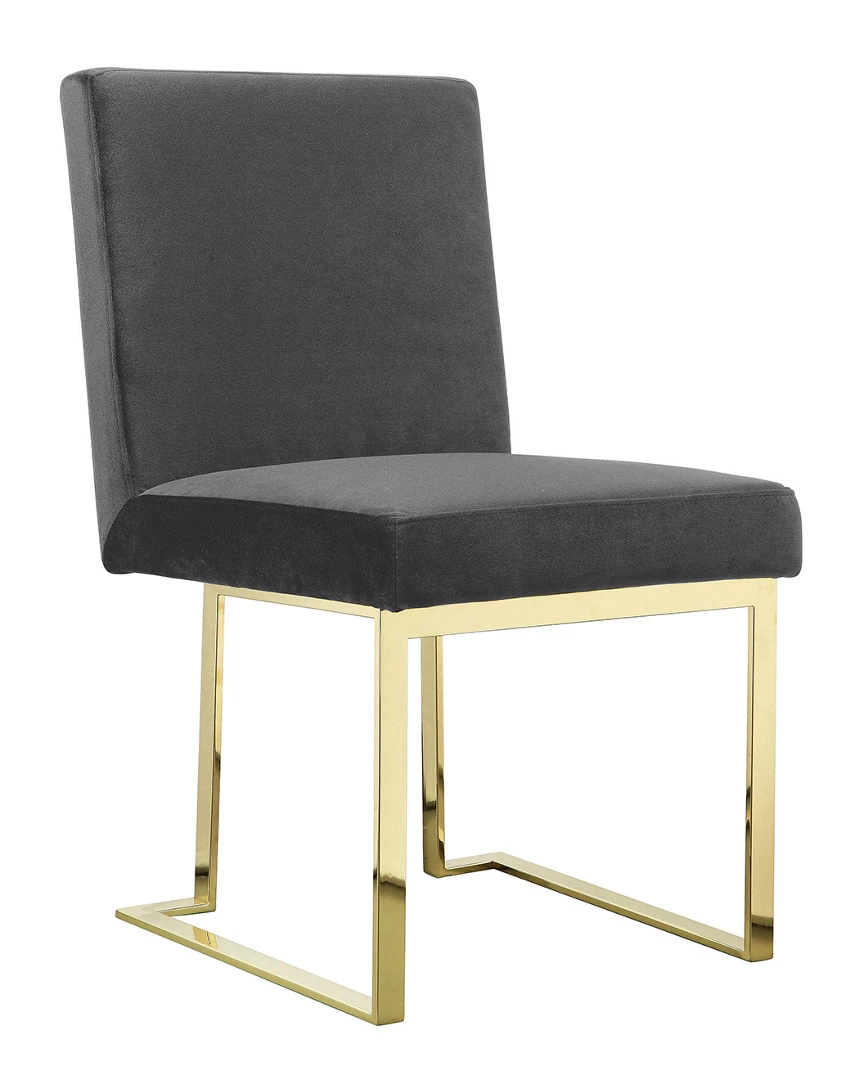 - Design details: Set of 2 dining chairs. Sleek and modern dining dining chair with gold toned steel legs and hardware; seat height is 18.5″; velvet steel/metal