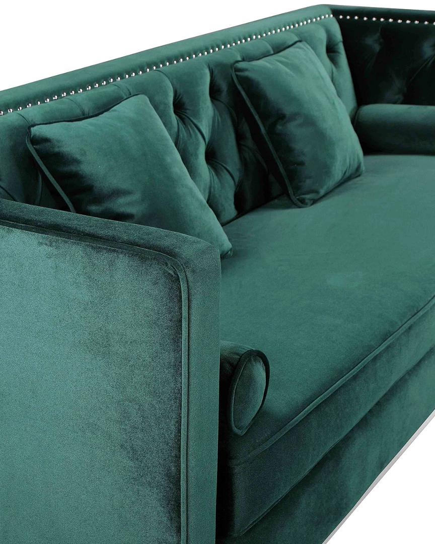 - Design details: Velvet tufted sofa with nail heads; modern meets glam; Seat height is 18″; velvet with polished steel