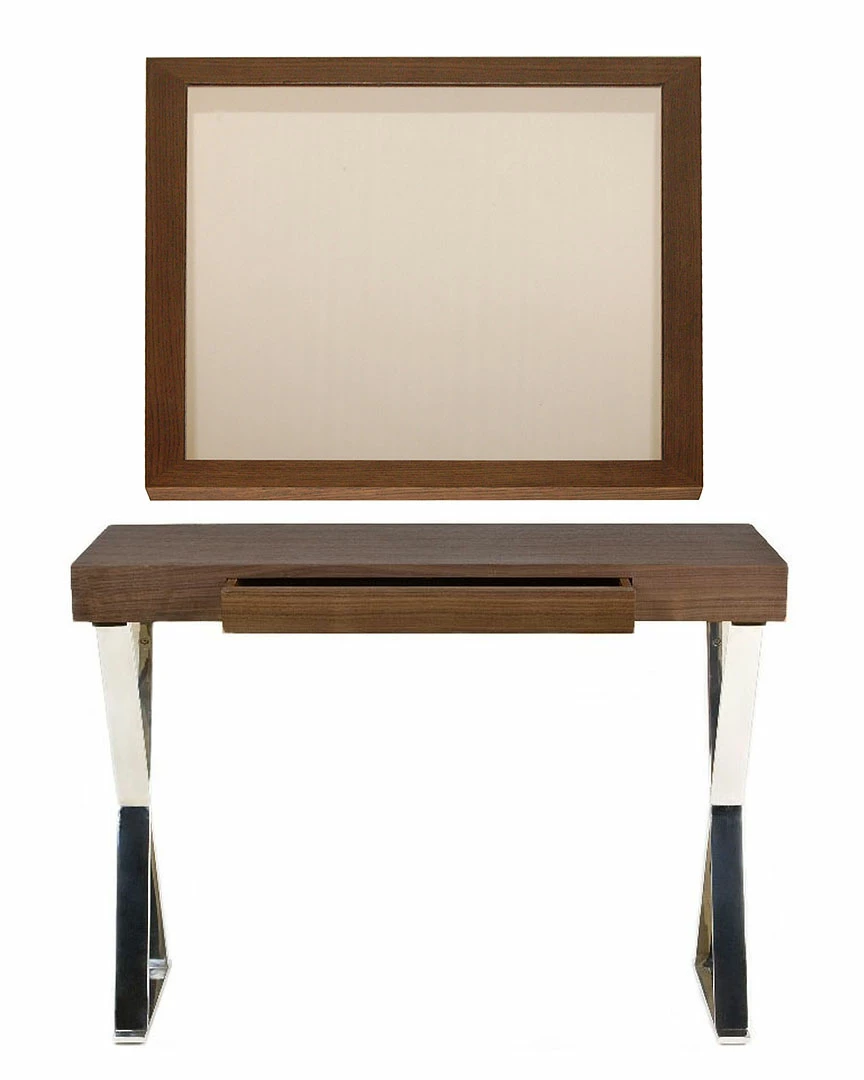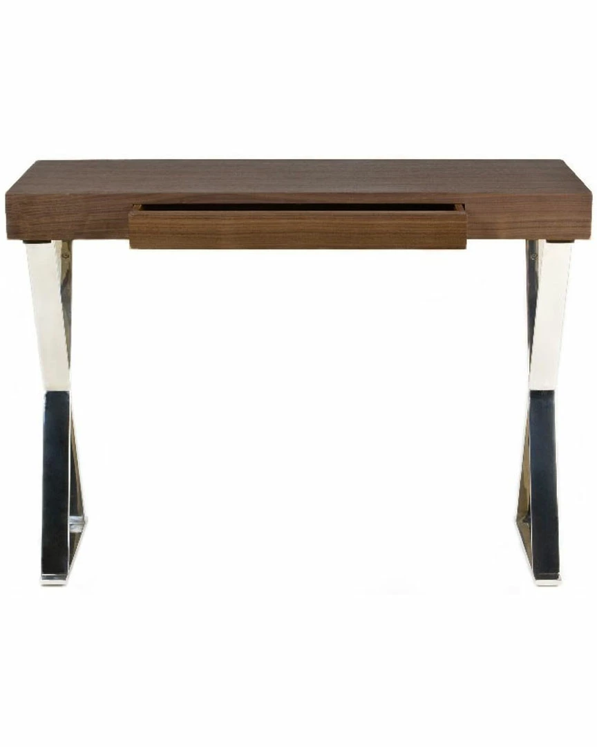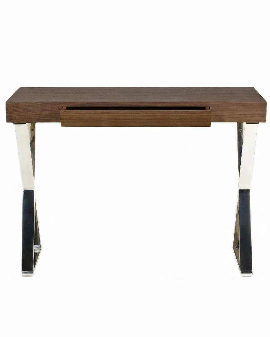 - Design details: Console with a pull out drawer and high polished X-shaped steel legs. Inside drawer measures 13Dx20Wx1.5H. Console may also be used as a small desk. It is finished on all sides; table top is fully assembled; ; wood veneer with high polished steel legs