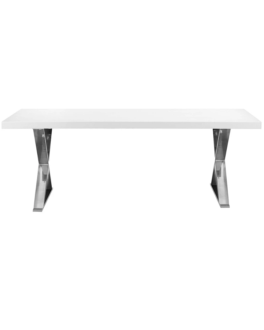 - Design details: Ultra modern and chic dining table with high polished X-shaped steel legs. This piece will make a big statement in your dining room. Sits up to 8 people. Distance between legs is 60″. Basic Assembly required; high gloss lacquer with high polished steel legs